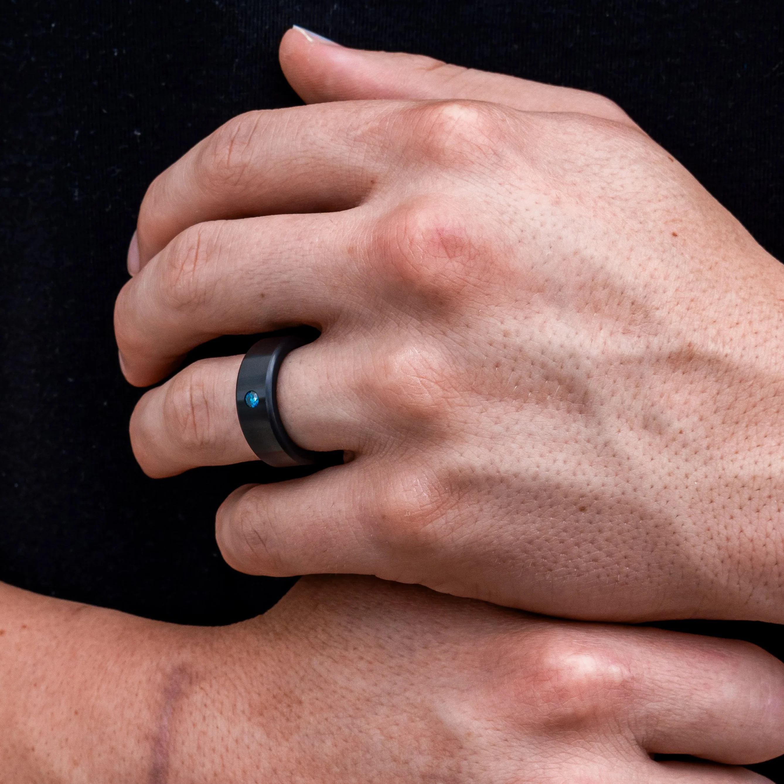 Elysium Kratos - Solid Black Diamond ring w/ a blue diamond inset. Each of our rings is made of millions of pressed diamond crystals formed into a solid diamond band that becomes black due to the enormous pressure & heat. Elysium Black Diamond is rated a 10 on the Mohs scale, making it the hardest and most-scratch resistant material on earth, the perfect symbol of your commitment.